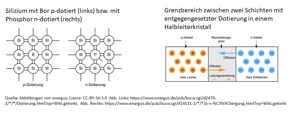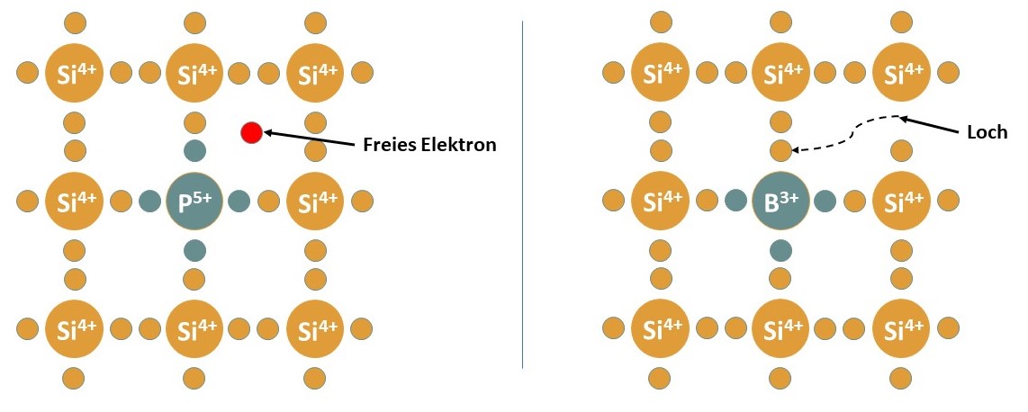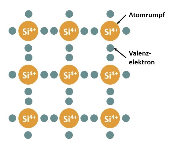 Silizium bildet in seiner kristallinen Form ein regelmäßiges Atomgitter, dabei sind für jedes Atom vier äußere Elektronen, die Valenzelektronen, gleichmäßig verteilt. Die Elektronen zweier benachbarter Atome bilden ein Elektronenpaar. In diesem Zustand sind die Valenzelektronen fest gebunden und können nicht fließen. Das Silizium leitet in diesem Zustand keinen Strom.