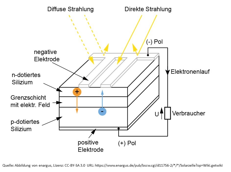 Wesentlicher Bestandteil der Solarzelle ist das Element Silizium, dass als Halbleiter wirkt und ein Halbmetall ist.