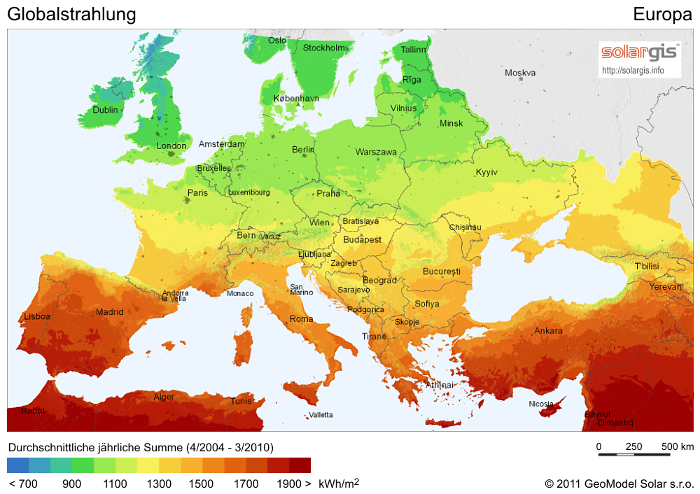 (Grafik: "SolarGIS-Solar-map-Eurpoe-de.png" von SolarGIS © 2011 GeoModel Solar s.r.o. auf wikimedia commons, Lizenz: CC-BY-SA 3.0)