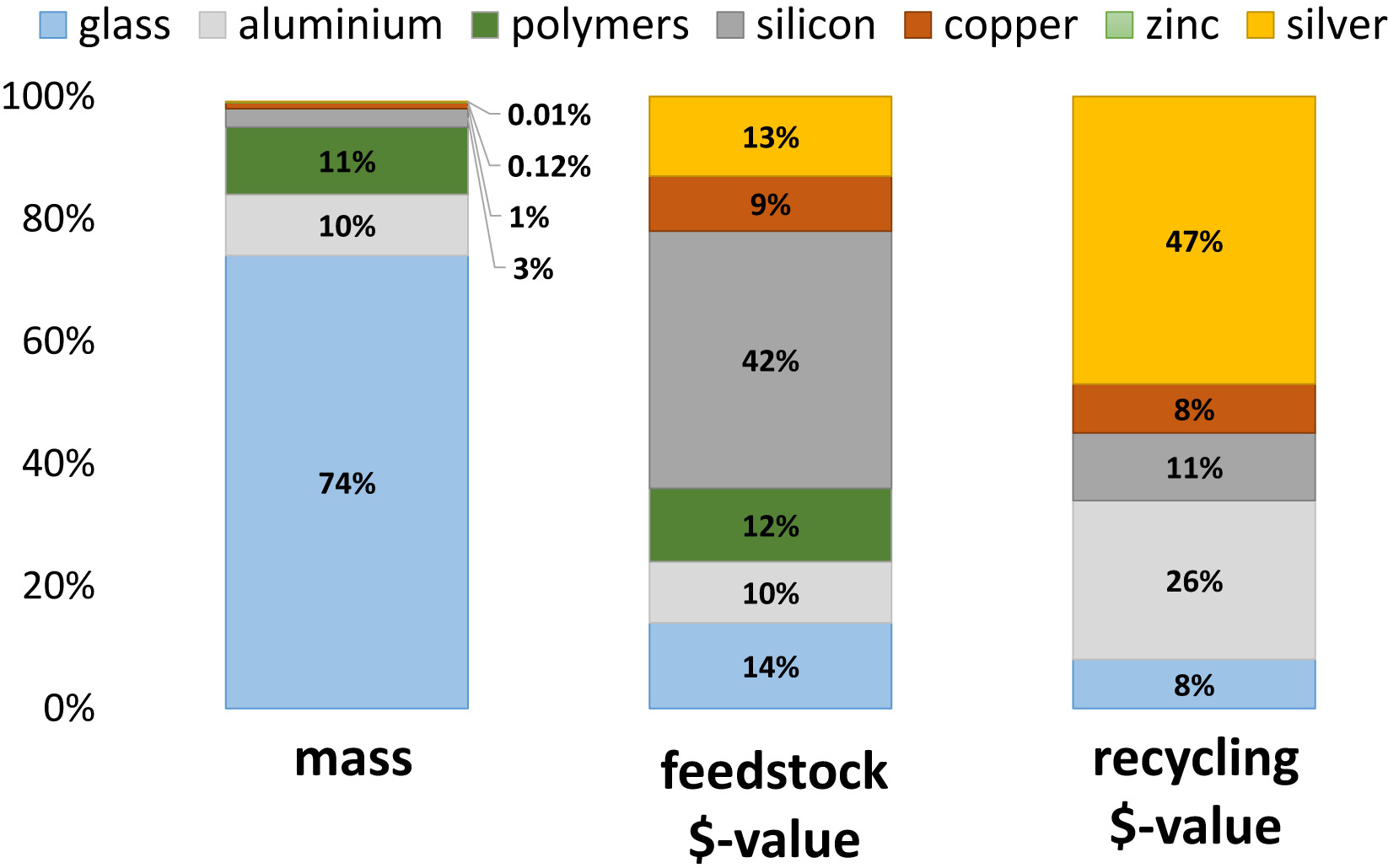 Abb: Distribution of mass and values in a silicon solar panel using the initial material feedstock (middle) and the recycling value (right). (Quelle:Peters, Ian Marius et al.(2024): Cradle-tocradle recycling in terawatt photovoltaics: A vision of perpetual utility, in:Joule, Volume 8, Issue 4, 899 - 912; open access article distributed under the terms of CC-BY)