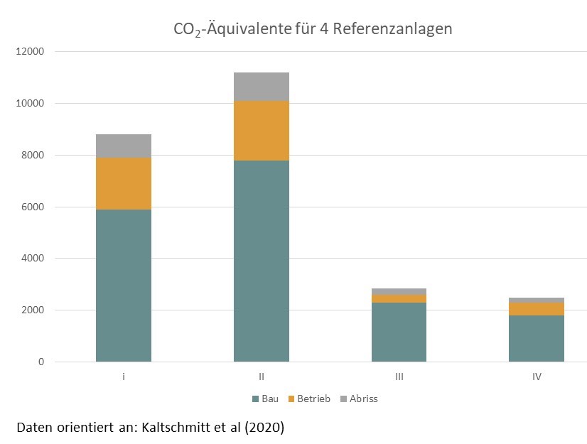 Der Bau von Talsperren, Staudämmen oder Wehren, der für den Betrieb von Wasserkraftwerken notwendig ist, bringt für die Natur aber auch drastische Eingriffe mit sich. Für die Errichtung der Anlagen wird ein Großteil der Schadstoffäquivalente im Laufe des Lebenszyklus benötigt. Je nach Anlagenart und Größe unterscheiden sich die Emissionen pro erzeugter kWh drastisch. Die in der Abbildung dargestellten CO2-Äquivalente sind für vier Referenzanlagen, die alle Laufwasserkraftwerke mit unterschiedlichen technischen Spezifikationen sind, dargestellt. Ein Großteil der Emissionen wird durch den Bau des Wehres oder Staudammes, der viel Beton und Stahl benötigt, aber auch für den Bau des Kraftwerks, benötigt. Der Betrieb verbraucht nur einen kleineren Teil der Emissionen. Der Rückbau ist bei solchen Anlagen bisher selten der Fall. In der Regel sind solche Anlagen sehr langlebig, ihre Lebensdauer wird mit 80 Jahren angenommen. In der Regel erfolgen außerdem Instandsetzungsarbeiten und Modernisierungen, so dass viele Anlagen deutlich älter als 80 Jahre alt werden.
