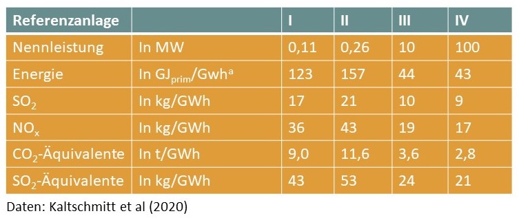 In folgender Tabelle sind die Leistung der Anlagen, die Stickstoff- und Säurebelastungen sowie die benötigte fossile Primärenergie pro kWh verzeichnet. Insgesamt lässt sich feststellen, dass je größer und leistungsfähiger die Anlage, desto geringer ist die Umweltbelastung pro produzierter Stromeinheit bezogen auf diese Parameter.