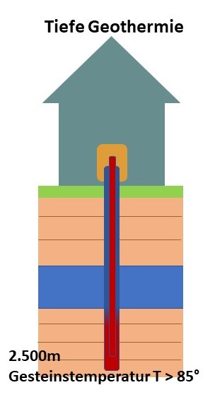 Das Prinzip des Geothermiekraftwerks ist für hydrothermale und petrothermale Anlagen das gleiche: Mithilfe der Wärme wird Wasserdampf oder ein anderes Dampfmittel erwärmt und über Turbine und Generator Strom gewonnen. In vielen Fällen wird die Wärme nach der Stromerzeugung als Fernwärme genutzt. Das erkaltete Medium wird dann zurück in den Untergrund gepumpt. Schematisch ist das in der Abbildung dargestellt, wobei zu beachten ist, dass hier meist getrennte Kreisläufe vorhanden sind, also das geförderte Wasser nicht in die Turbine oder Fernwärme geht.