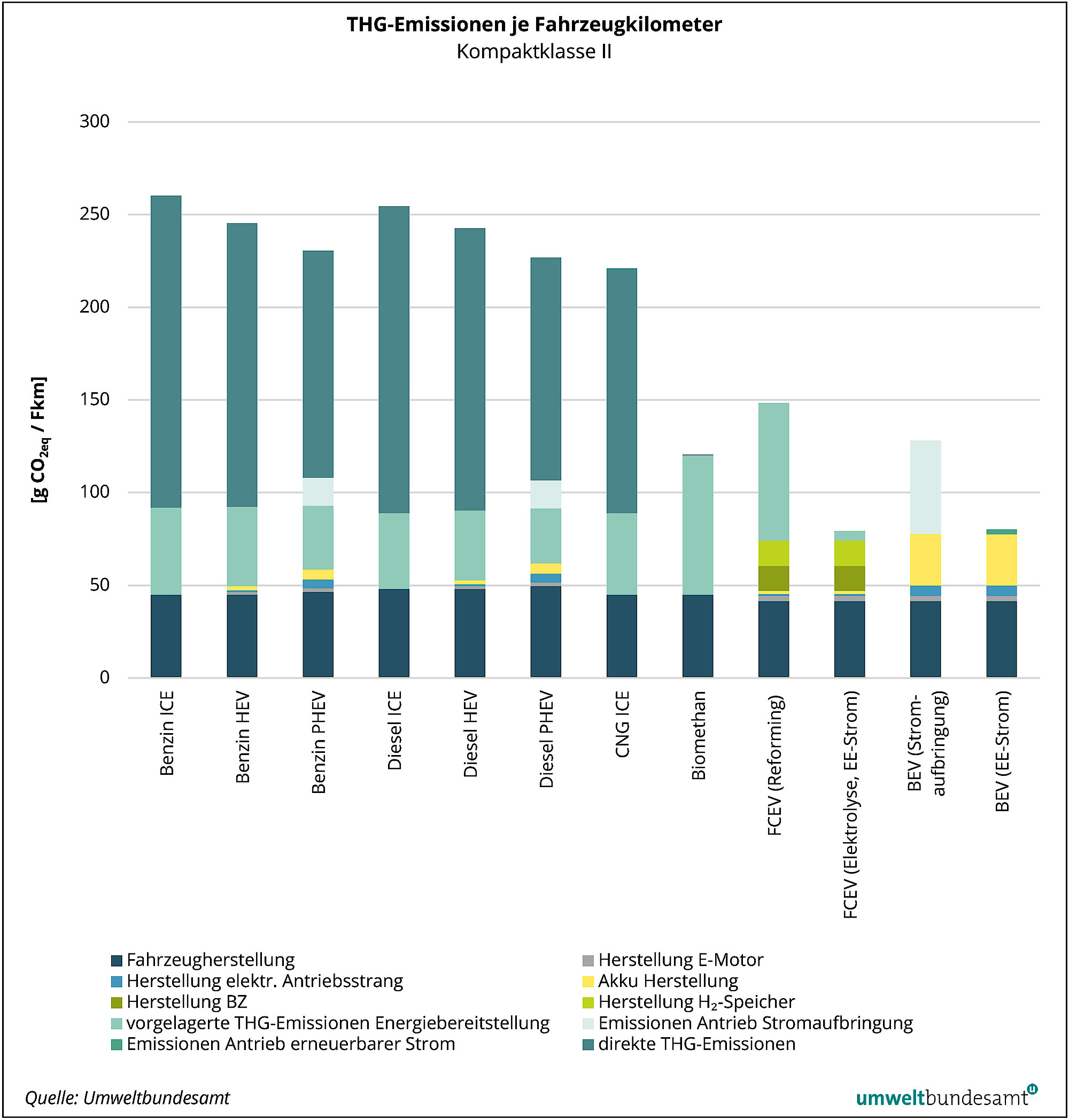 2eq pro Kilometer weist der Elektro-Pkw (mit 55 kWh Akku) auf, der mit Netzstrom fährt. Er liegt … um 41 % unter dem Benzin-Pkw.“(Umweltbundesamt, 2024: S. 103).