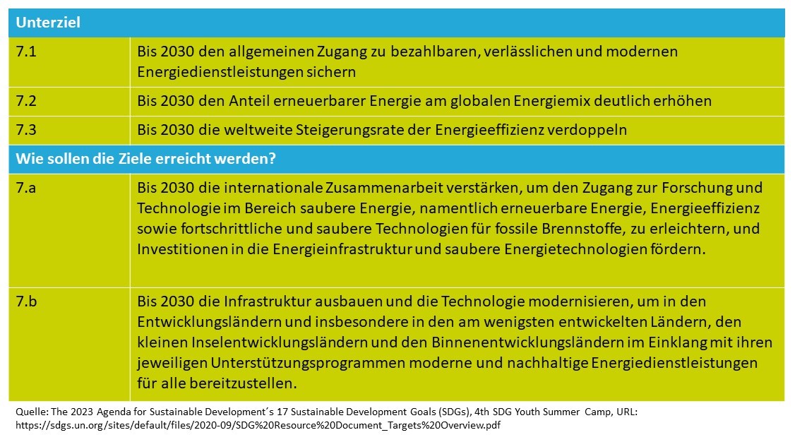 Besonders relevant für diese Veranstaltung ist das SDG 7 "Bezahlbare und Saubere Energie“. „Es soll bis zum Jahr 2030 für alle Menschen der Zugang zu bezahlbarer, verlässlicher, nachhaltiger und zeitgemäßer Energie erreicht werden. Zudem soll der Anteil von Erneuerbaren Energien im weltweiten Energiemix deutlich erhöht und die Steigerungsrate der Energieeffizienz verdoppelt werden. Insbesondere die Länder des globalen Südens sollen dabei unterstützt werden, ihre Energieinfrastruktur auszubauen und Energietechnologien weiterzuentwickeln“ (Zitat nach BMUV 2023). Die Unterziele des SDG7 gliedern sich wie folgt: