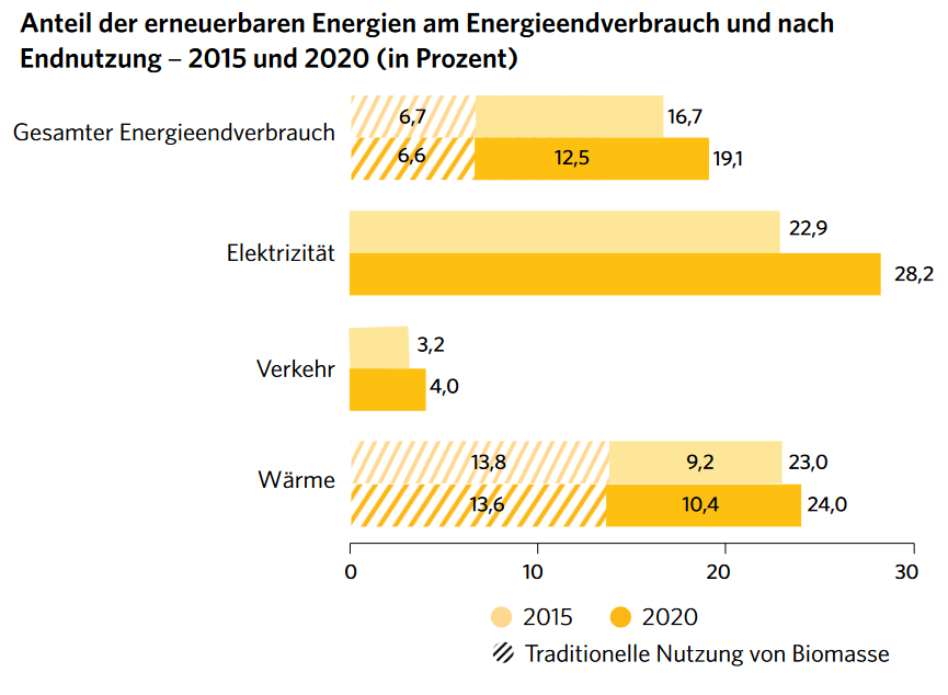 "2020 machten erneuerbare Energiequellen weltweit 19,1% des gesamten Energieendverbrauchs aus. Das ist ein Anstieg um 2,4 Prozentpunkte seit 2015. Im selben Zeitraum stieg der Gesamtverbrauch an Erneuerbaren Energien um 16%. Die traditionelle Nutzung von Biomasse – etwa die Verwendung von Brennholz für offene Kochvorrichtungen oder Kamine – lag 2020 noch immer bei mehr als einem Drittel der Gesamtnutzung Erneuerbarer Energien“.