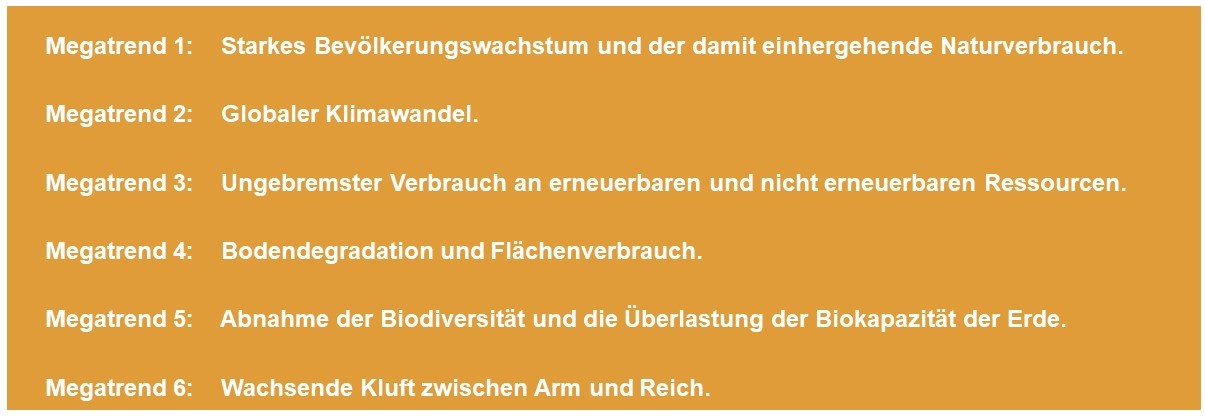 Werner Mittelstaedt fasste die aktuellen und prognostizierten Entwicklungen im Jahr 2012 in Form von sechs sogenannten Megatrends zusammen. Megatrends deshalb, weil Sie global relevant waren und ihre Folgen besonders drastisch sein könnten. Diese Megatrends verursachen tiefgehende ökologische, soziale und ökonomische Krisen, die allerdings mit einer konsequenten nachhaltigen Entwicklung gelöst werden könnten: