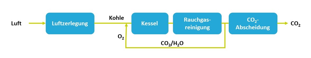 Deshalb bedarf es in der Zementindustrie zusätzlicher CO2-Abscheideverfahren, beispielsweise mit dem Oxyfuel-Verfahren. Bei dem Oxyfuel-Verfahren wird statt der Umgebungsluft reiner Sauerstoff in den Verbrennungsprozess des Zementofens eingespeist. Der dafür benötigte Sauerstoff stammt aus der Elektrolyse und wird verflüssigt in Tanks am Zementwerk vorgehalten. Im Ergebnis entsteht beim Oxyfuel-Verfahren im Zementofen hochreines CO2.