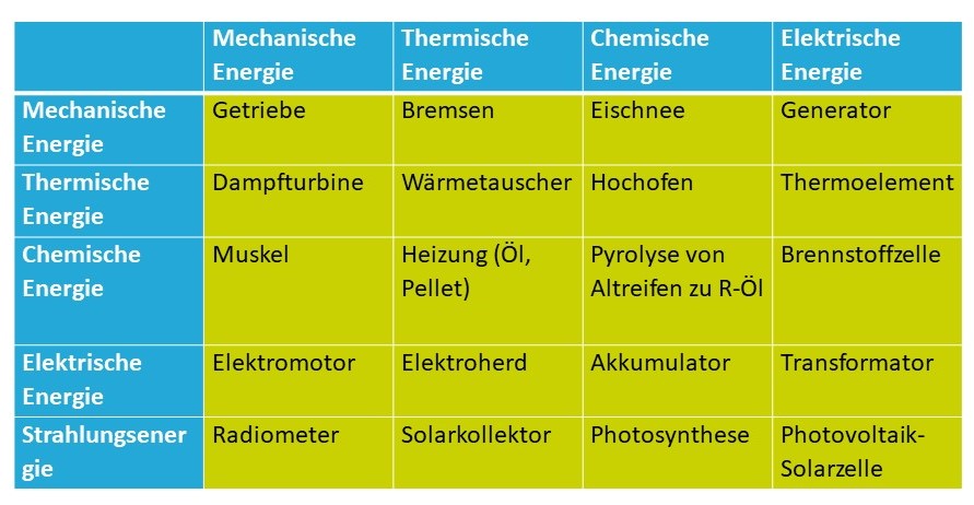 Zum Beispiel wird im Kraftwerk aus chemischer Energie (Kohle) über Wärmeenergie (Kessel) und mechanische Energie (Turbine) elektrische Energie über den Generator erzeugt bzw. bei Kraft-Wärmekopplungsanlagen ebenfalls Wärme ausgeschleust.