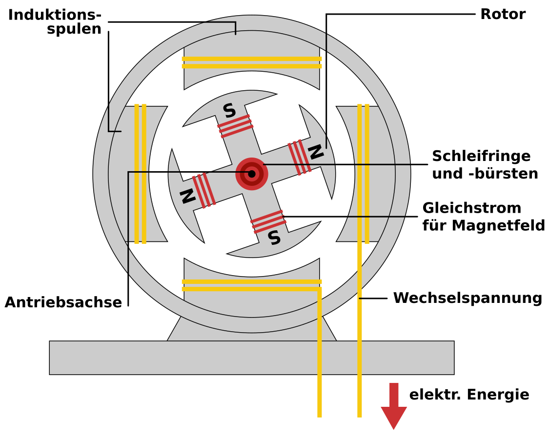 Prinzip eines Generators: Ein elektrischer Generator (zu lateinisch generare ‚hervorholen', ‚erzeugen') ist eine elektrische Maschine, die Bewegungsenergie in elektrische Energie wandelt. Der Generator ist das Gegenstück zum Elektromotor, der elektrische Energie in Bewegungsenergie wandelt. Der Generator kann durch Wind-, Wasser oder Dampfturbinen angetrieben werden. Generatoren arbeiten nach dem Prinzip der elektromagnetischen Induktion (Induktionsgesetz). Zur Induktion einer Spannung in einem Leiter kommt es, wenn der Leiter entweder in einem Magnetfeld bewegt wird oder der Leiter in einem veränderlichen Magnetfeld ruht. Es entsteht eine Wechselspannung und somit Wechselstrom. Beide Möglichkeiten für Induktionsvorgänge werden in unterschiedlichen Generatortypen angewendet.