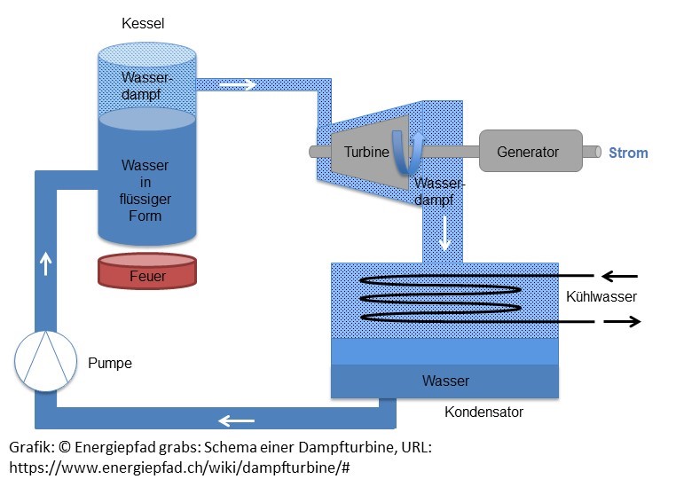 Prinzip einer Wasser- oder Dampfturbine: Eine Turbine ist eine Maschine, die Energie von Dampf, Gas oder Wasser in mechanische Drehbewegung umsetzt. Ein Mühlrad ist die einfachste Form einer Turbine. Dampfturbinen z.B. nutzen die aus dem Verbrennungsraum austretende heiße Abluft, den Dampf. Das heiße Gas setzt die Turbinenschaufeln in Bewegung. Die Turbinenwelle treibt einen Generator an, der Strom erzeugt. Der abgearbeitete Dampf wird im Kondensator zu Wasser abgekühlt, das wieder in den Dampferzeuger zurück gepumpt wird. Die Dampfturbine besteht im Wesentlichen aus einem Gehäuse mit Leitschaufeln und einer schnell rotierenden Welle mit Turbinenschaufeln (Laufschaufeln).