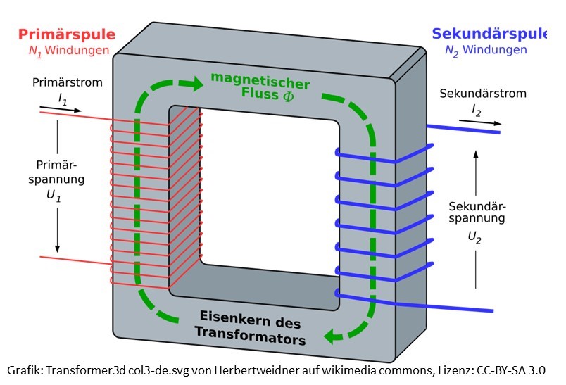 Mit einem Transformator lässt sich einerseits Wechselstrom mit hoher Spannung erzeugen, der sich andererseits am Zielort wieder auf niedrigere Spannung heruntertransformieren lässt. Erst diese Technologie ermöglichte damals den Aufbau von Stromnetzen über immer größere Strecken.Prinzip eines Transformators: Das Funktionsprinzip von Transformatoren beruht auf der elektromagnetischen Induktion. Trafostationen kommen bei Übertragungsnetzen zum Einsatz. An der Primärseite (Eingangsseite) wird die Eingangsspannung angeschlossen. Er erzeugt ein sich wechselndes Magnetfeld. Dieses gelangt durch den Eisenkern zur Sekundärspule und erzeugt durch eine Induktion eine Sekundärspannung. Es kommt dann zu einem Sekundärstrom (Ausgangsspannung). Diese kann abhängig von der Windungszahl der Ausgangsspule größer oder kleiner sein als die Eingangsspannung.