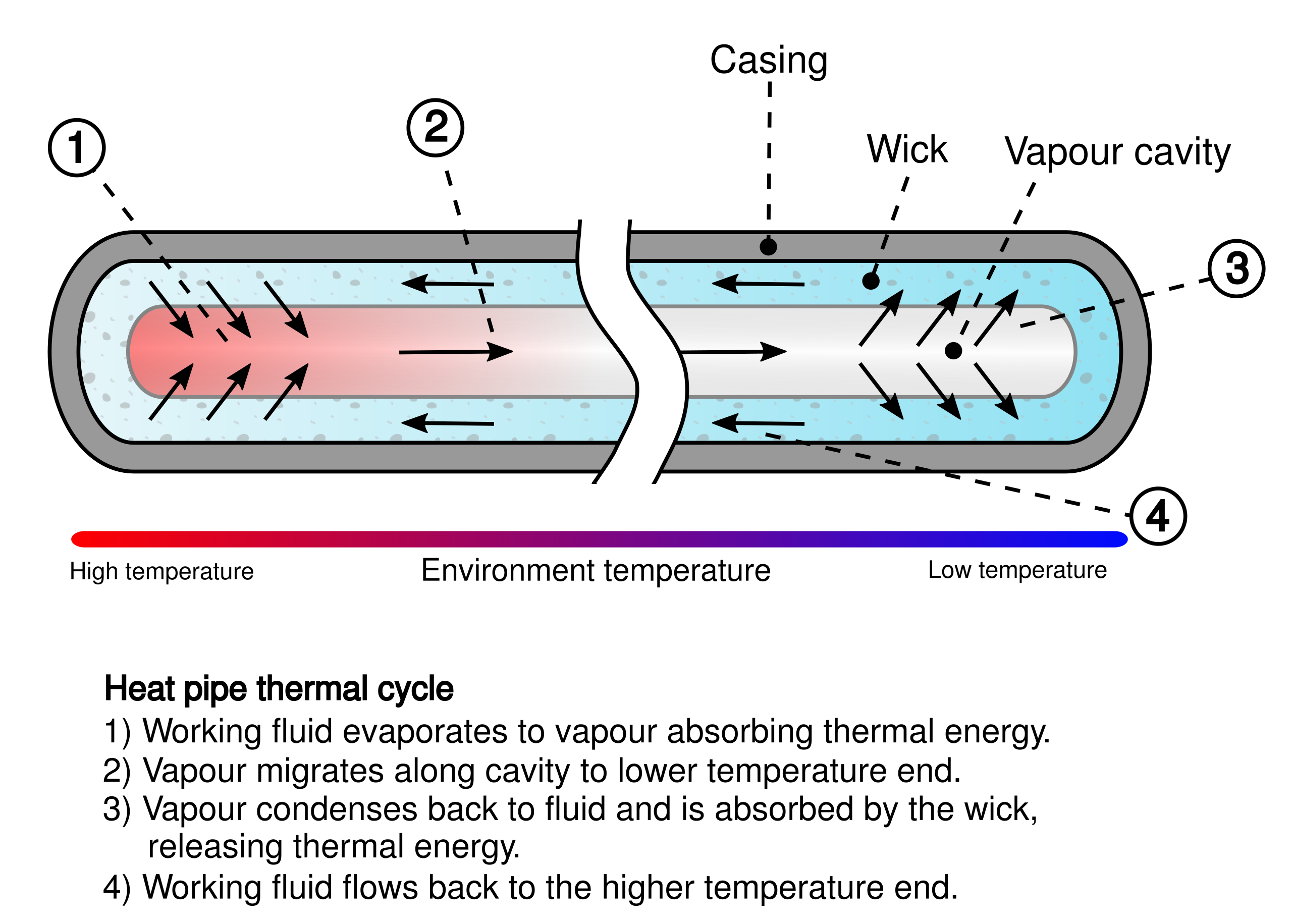 (Bild: Heat Pipe Mechanism.svg von Zootalures und Offnfopt auf wikimedia commons, Lizenz CC-BY-SA 3.0)