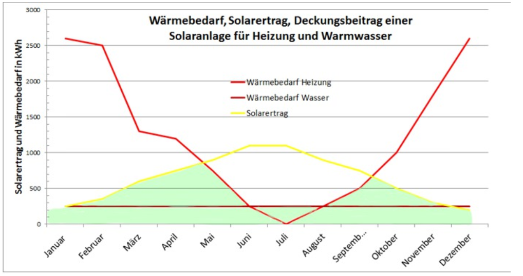 Kleinere solarthermische Anlagen auf der Basis von Sonnenkollektoren haben ihren Wärmeangebots-Peak im Sommer, was in Deutschland der typischen U-Form des Wärmebedarfs diametral entgegenläuft (vgl. Bild).