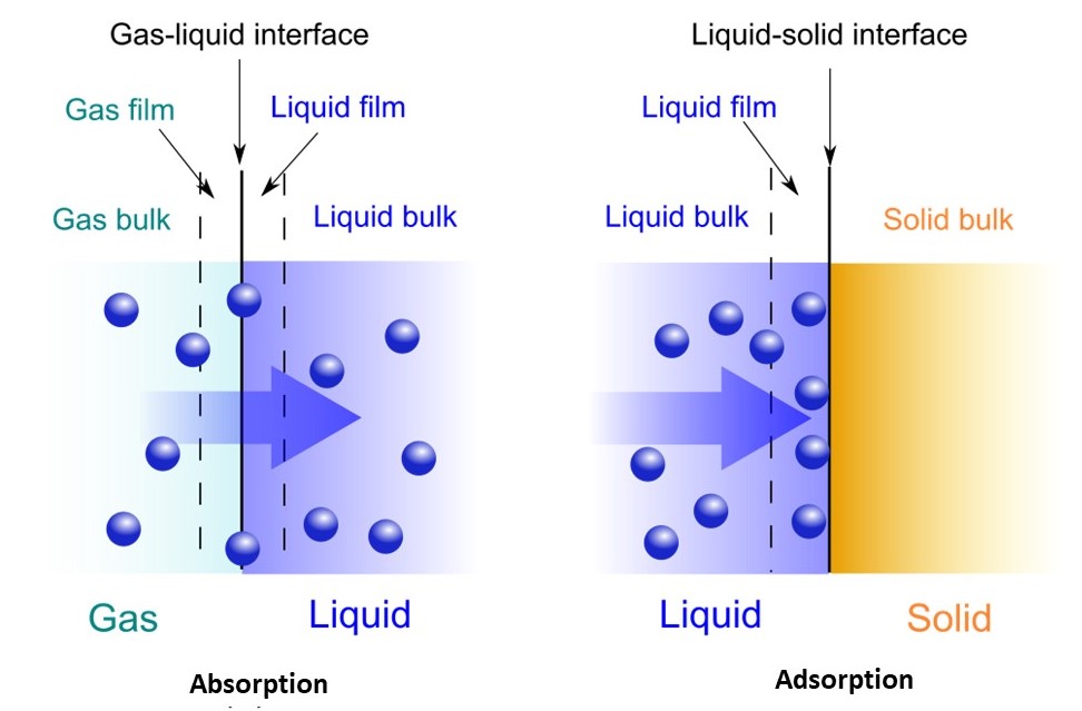 (Quelle: Bild Absorbimento e adsorbimento von Daniele Puglieso auf wikimedia commons, Lizenz: CC-BY-SA 3.0)