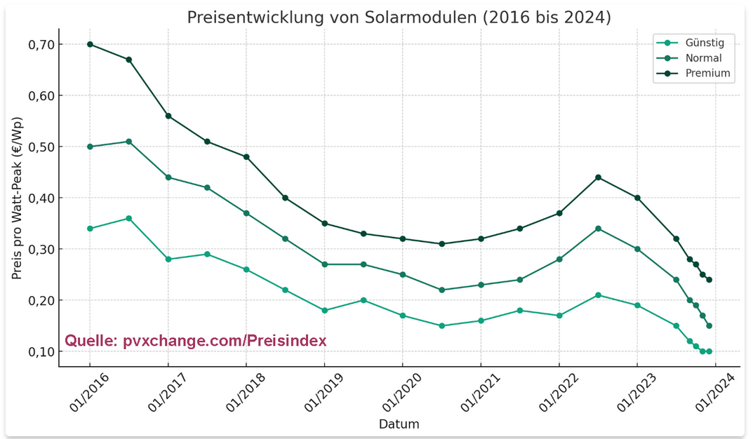 (Quelle: ©Burkhardt, Jens (2024): Preisentwicklung Photovoltaik: aktuelle Fakten und Daten 2024 auf www.echtsolar.de, URL: https://echtsolar.de/preisentwicklung-photovoltaik/, Daten von pvxchange.com)