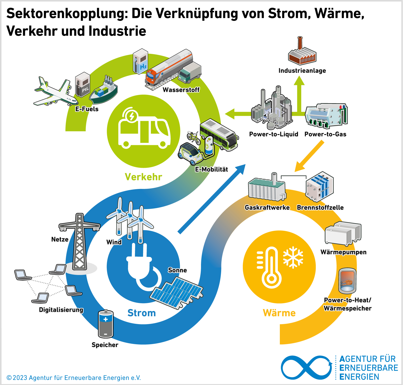 Die Sektorenkopplung ermöglicht neben der Dekarbonisierung von Wärme und Verkehr zeitgleich eine Flexibilität für den Stromsektor, um die Volatilität von Sonnenstrom und Windstrom durch neue Speicher und Energieträger auszugleichen.