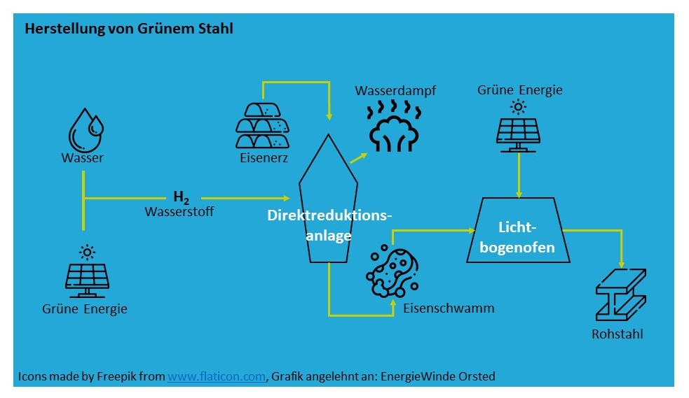Wichtig zu klären ist: woher kommen die CO2-Emissionen in der Eisen- und Stahlindustrie? Die wesentlichen CO2-Emissionen der Hochofen-Konverter-Route, also bei der Herstellung von Primärstahl, sind durch den prozessbedingten Einsatz von Kohlenstoff (Koks, hergestellt aus Kohle in der Kokerei) zur Reduzierung der Eisenerze bedingt. Reduktion bedeutet hier die Entfernung von Sauerstoff aus Eisenerz, das Koks dient hierbei als Reduktionsmittel. => Die CO2-Emission dieses klassischen Verfahrens liegt bei 1,5 bis 1,7 t CO2 pro t Rohstahl. Herstellung von grünem Stahl Deshalb werden in den nächsten Jahren die Eisen- und Stahlwerke in Deutschland ihre Verfahren auf die sogenannte Direktreduktions-Elektrolichtbogenofen-Route (DRI-EAF) umstellen.