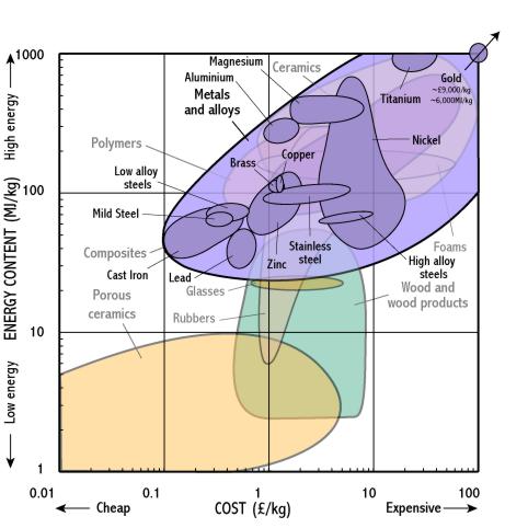In der untenstehenden Grafik sind die Energiekosten pro Kilogramm verschiedener Stoffgruppen, gegen den Handelspreis pro Kilogramm in Pfund-Sterling aufgetragen. Diese Stoffe sind jeweils in einer Vielzahl von Produkten enthalten und es ist zu erkennen, dass der Handelspreis mit dem Energieaufwand korreliert. Das liegt daran, dass die Energiekosten einen großen Teil der Gesamtkosten dieser Stoffe ausmachen.