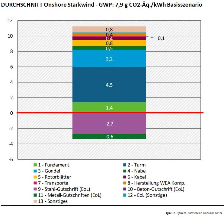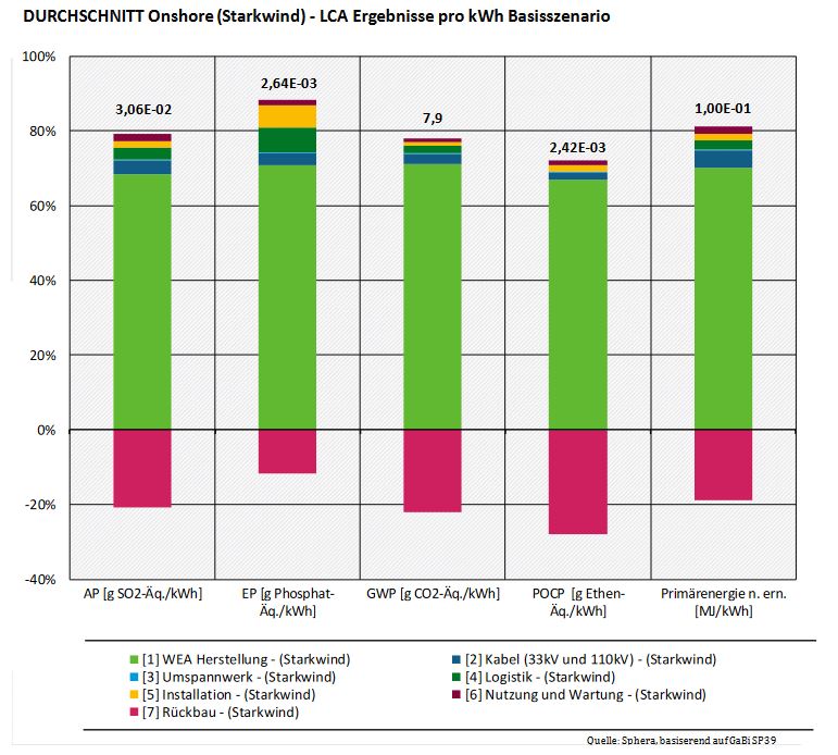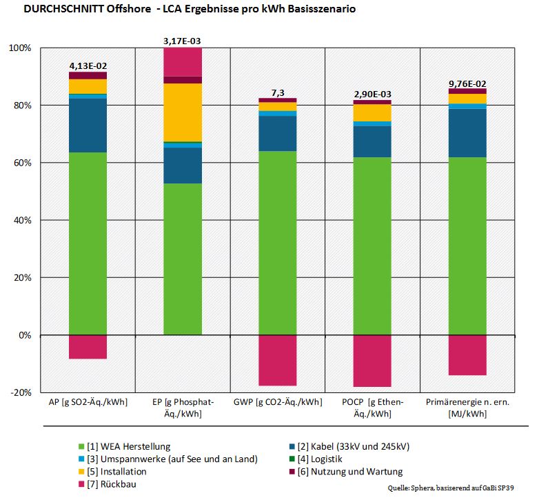 Neodym und Dysprosium werden für die Herstellung von Dauermagneten benötigt, die in bestimmten Getriebetypen und Generatoren eingesetzt werden, die besonders in Off-Shore Anlagen verbaute werden. Wenn man neben dem Treibhauspotential auch Versauerungspotential (AP), Eutrophierungspotential (EP), Ozonpotential (POCP) und den Primärenergieverbrauch betrachtet, wird klar, dass diese sich ähnlich dem GWP zusammensetzen. Jedoch wird das Eutrophierungspotential (EP) durch Installation und den Rückbau deutlich mehr verstärkt als die anderen Kategorien.