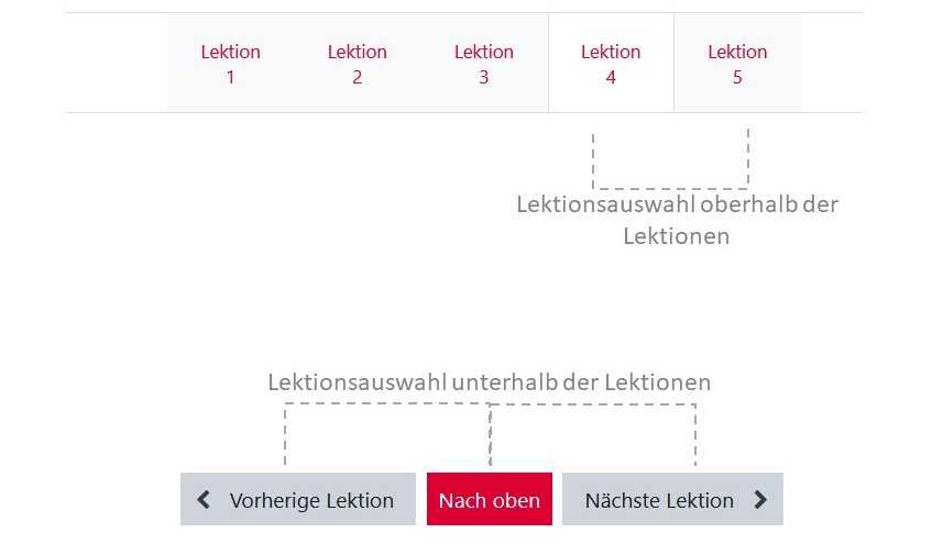 Jedes Kapitel ist in Lektionen unterteilt, in denen Sie die Lerninhalte und -aktivitäten finden. Sie navigieren dabei über die Reiter, die Sie gleich unterhalb der Kapitelgrafiken sehen. Außerdem können Sie am Ende jeder Lektion vor-, zurück- oder aber nach oben zum Anfang der Inhalte springen.