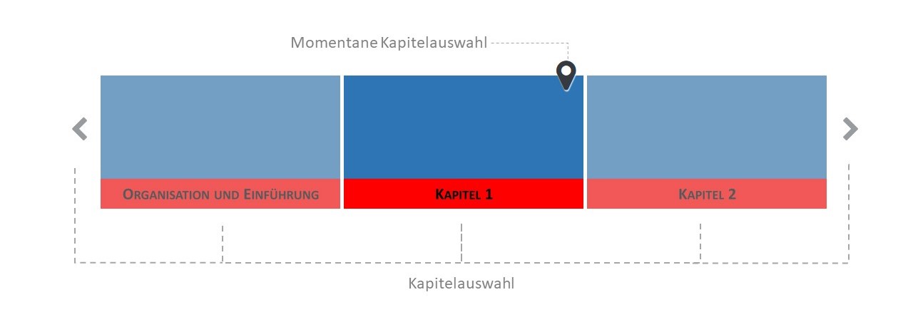 Sie haben die Möglichkeit mit Mausklick auf eine Grafik ein Kapitel direkt anzusteuern. Alternativ können Sie mit dem "Weiter" Symbol (>) durch die einzelnen Kapitel navigieren. Dabei sollten Sie dann auch noch einmal die gewünschte Kurskachel mit der Maus anklicken, damit die Lektionen zu diesem Kapitel korrekt angezeigt werden.
